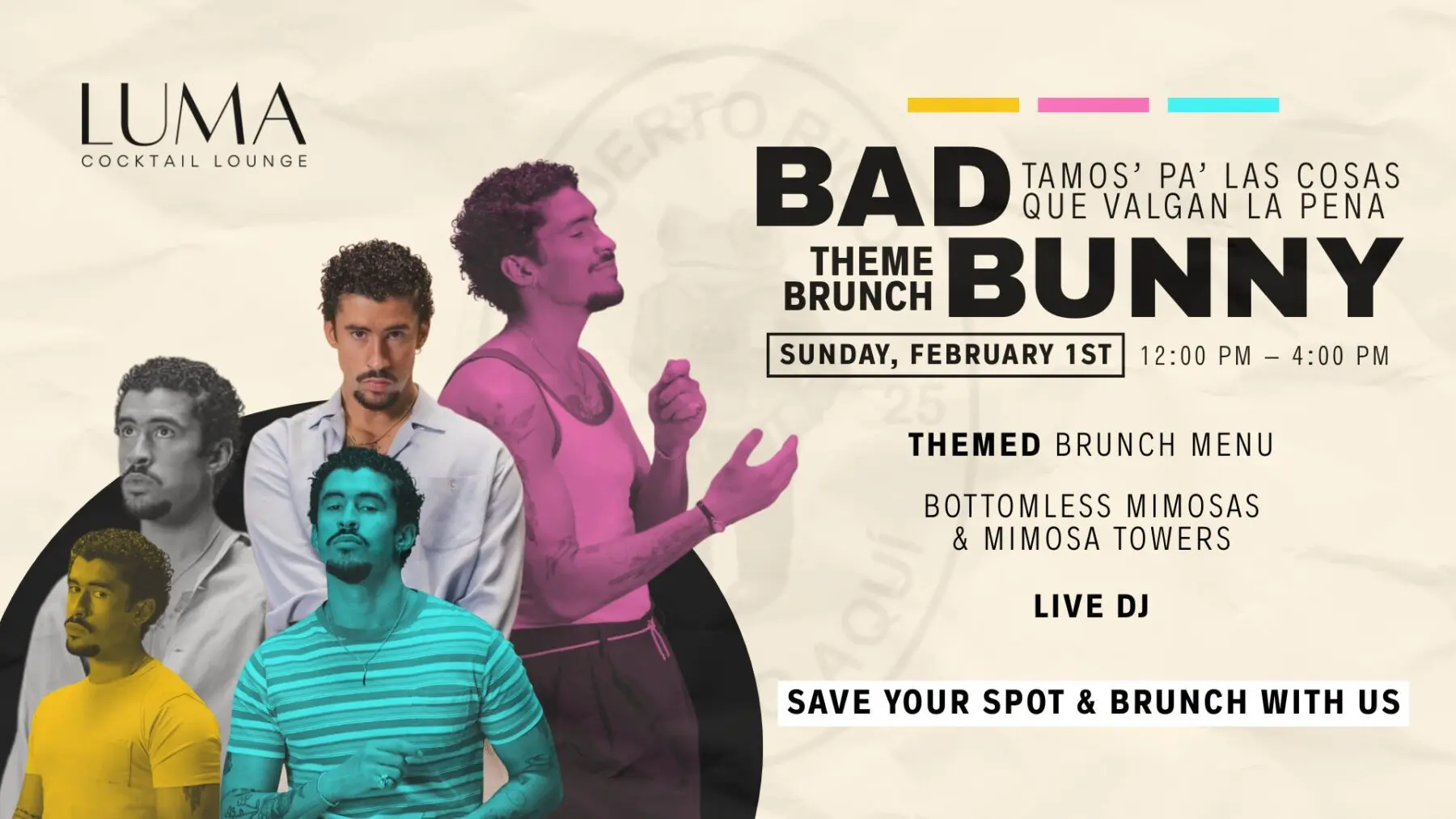 Join us at LUMA Cocktail Lounge for our Bad Bunny Theme Brunch, where good music, elevated vibes, and flowing mimosas come together for the perfect Sunday plan.