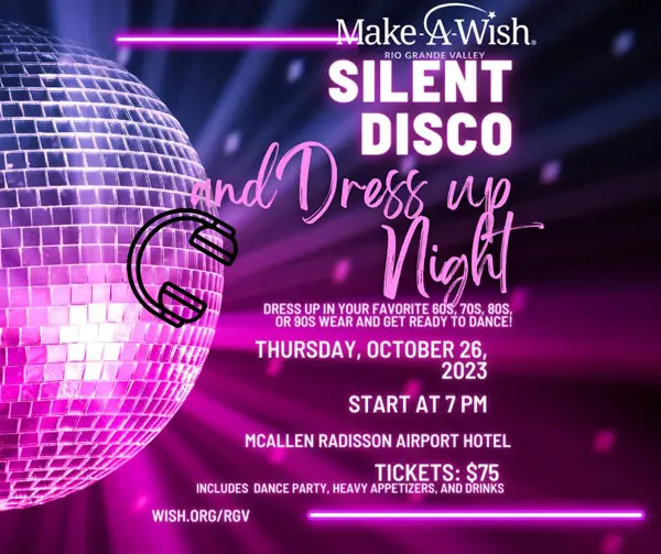 • Check out this silent disco and dress up party for a night of fun by playing dress up while enjoying some great music, food, and refreshments at the McAllen Radisson Airport Hotel, while supporting the make-a-wish foundation! Starting at 7 PM – 11 PM at 2721 S 10th St.